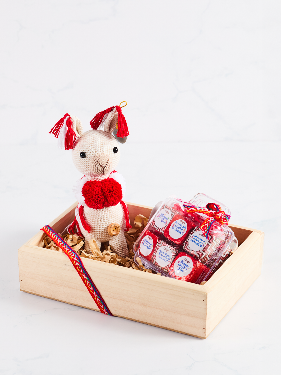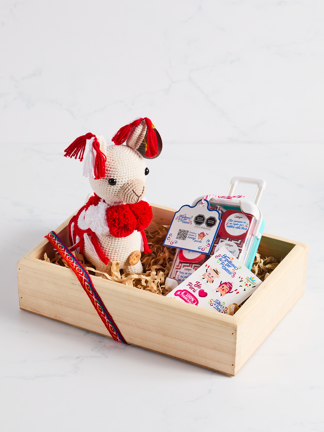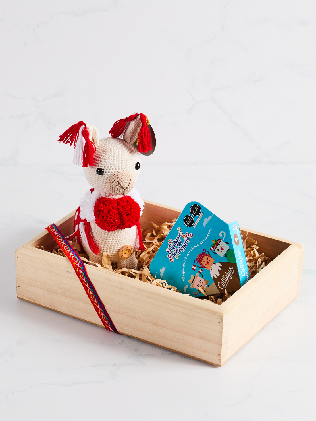Pack Llamita 30 cm Amigurumi + Catibox x4 Fiestas Patrias