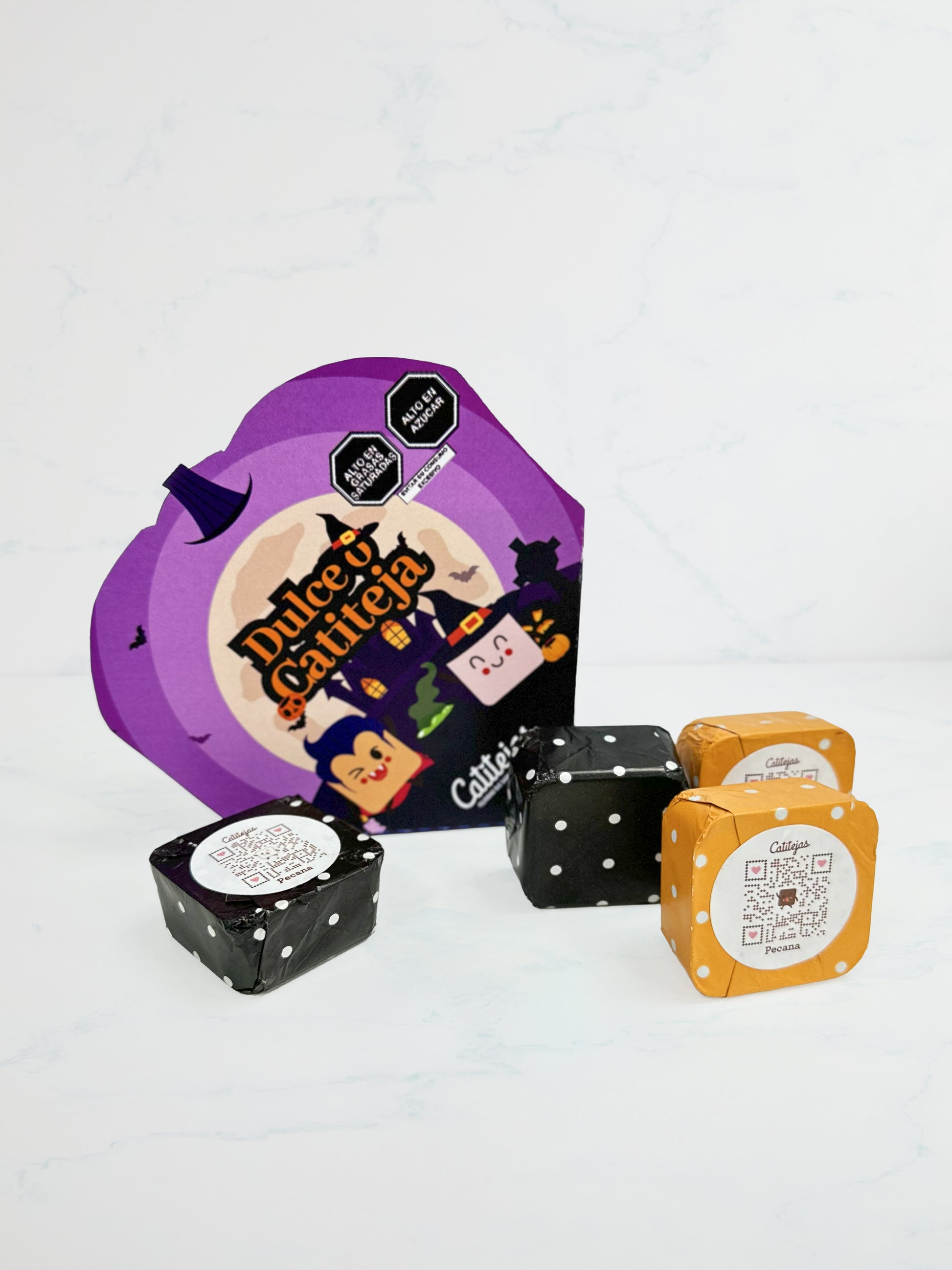 Disfruta de deliciosas combinaciones de rellenos como lúcuma, manjar y pecanas, cubiertas con chocolate bitter o blanco. Además, puedes personalizar cada catiteja, eligiendo tanto el empaque individual como el envase para su entrega, ¡haciendo de cada detalle algo único! Ya sea para ti o como regalo especial, nuestras Catitejas te ofrecen una experiencia llena de sabor y creatividad.