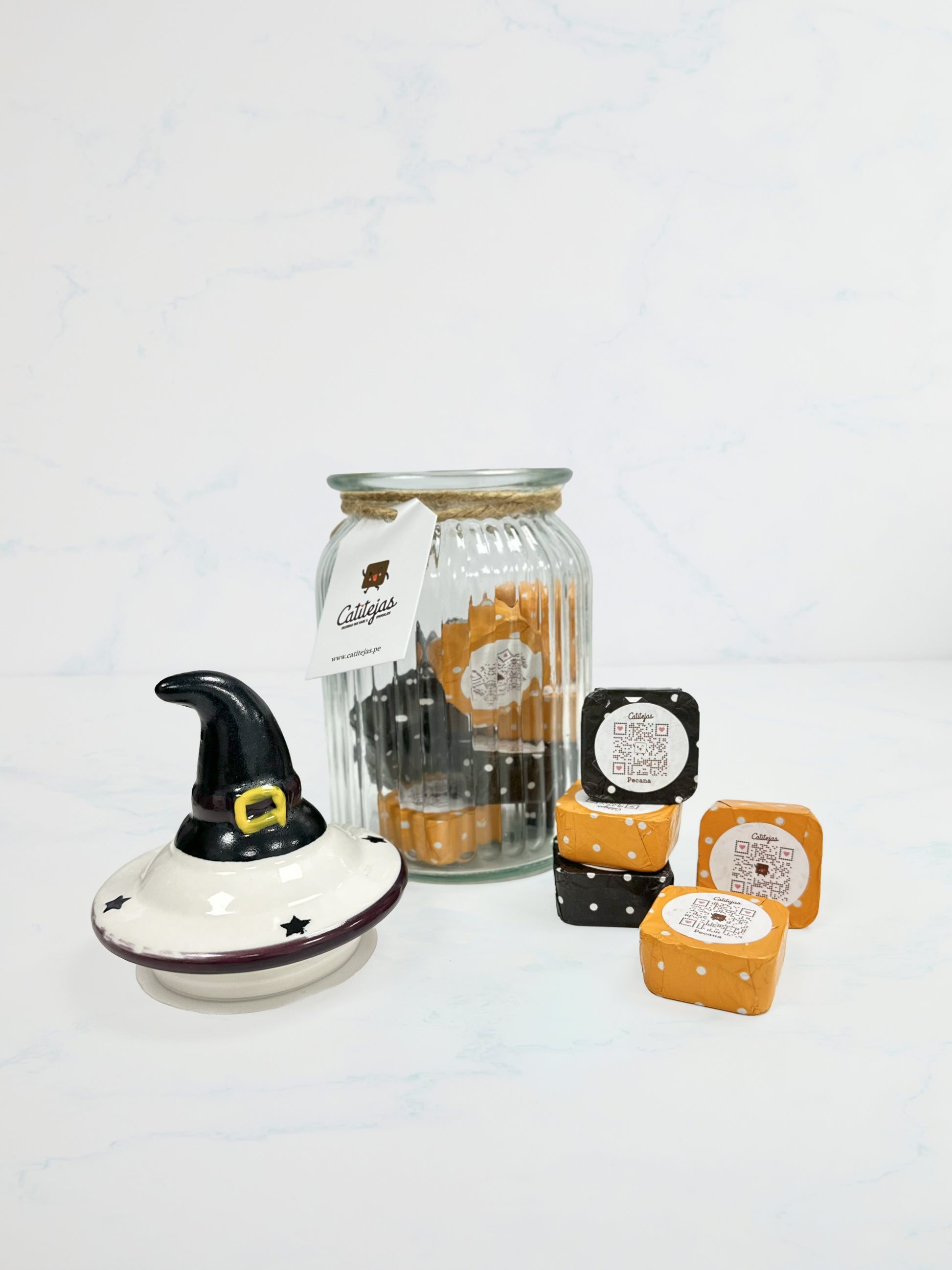 Catienvase de vidrio, con tapa de cerámica color blanco y detalle de sombrero de Brujita.