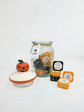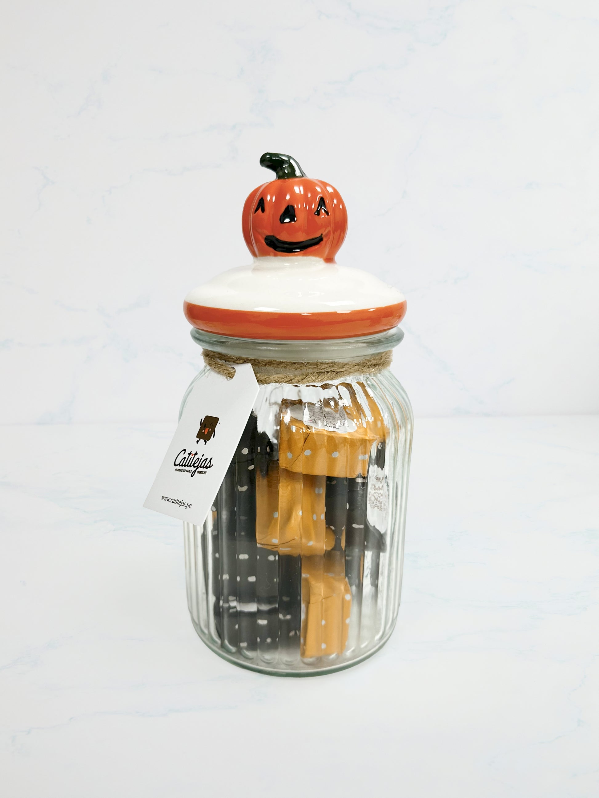 Catienvase de vidrio, con tapa de cerámica color blanco y detalle de Calabaza para 16 Catitejas.