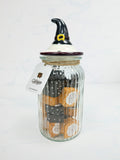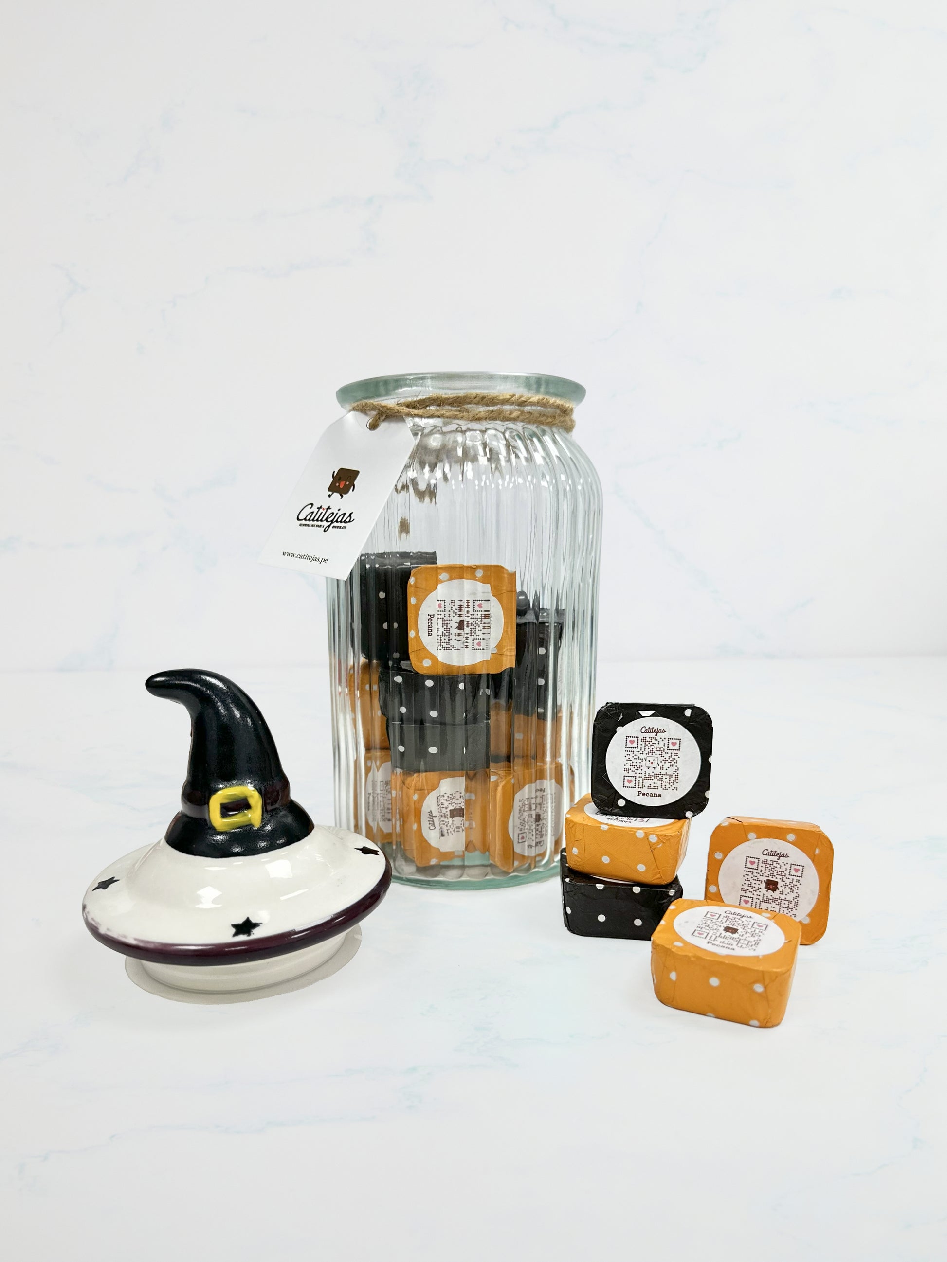 Catienvase de vidrio, con tapa de cerámica color blanco y detalle de sombrero de Brujita.